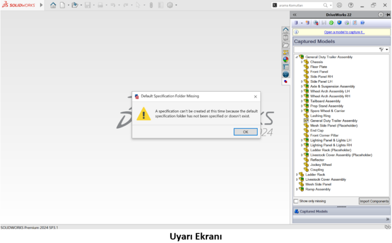 DriveWorks Default Specification Folder Missing Uyarısı