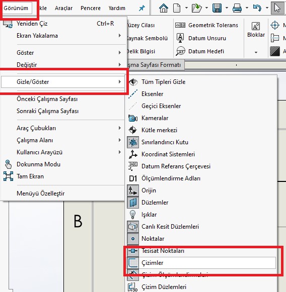 Büküm çizgilerini teknik resim üzerinde gözükmemesi halinde teknik resim sayfasında birtakım değişiklikler yapmanız gerekmektedir. Görünüm menüsünden Çizimleri göstermeniz gerekmektedir.…